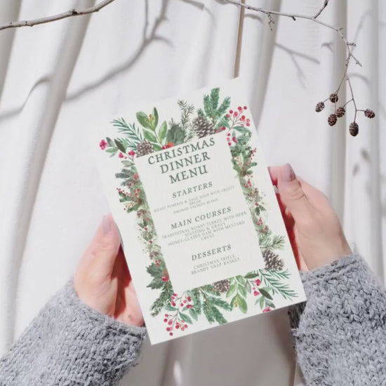 Featuring watercolor greenery, pinecones, and red berries, this set includes a Dinner Menu and Drinks Menu, beautifully designed to complement any holiday décor. Whether you’re hosting a cozy family meal or a full Christmas gathering, this printable template adds charm and sophistication to your celebration.