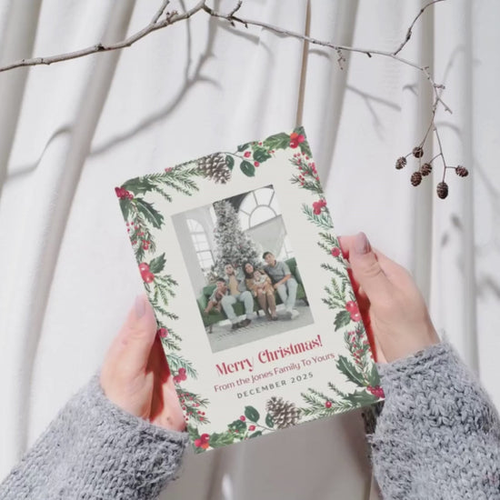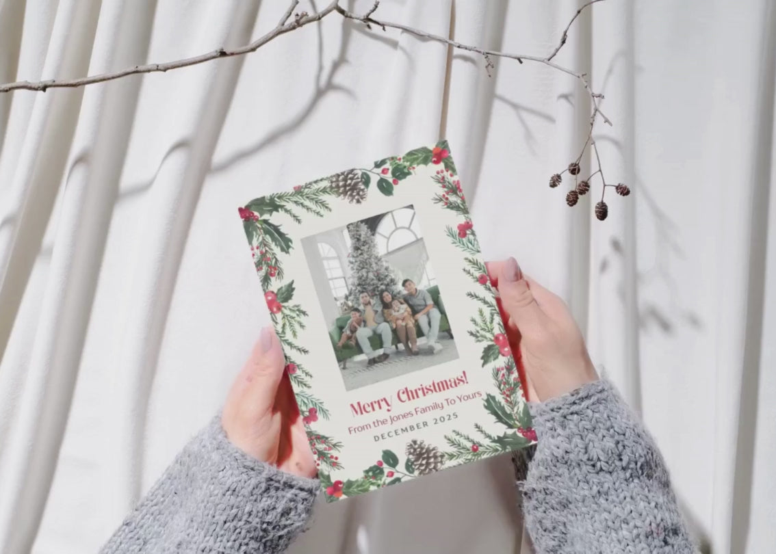 Designed with elegant watercolor greenery, pinecones, and holly berries, this festive card lets you easily add your own family photo and personalized message β all editable in Canva. Perfect for sharing your warmest holiday wishes with loved ones, friends, or clients!